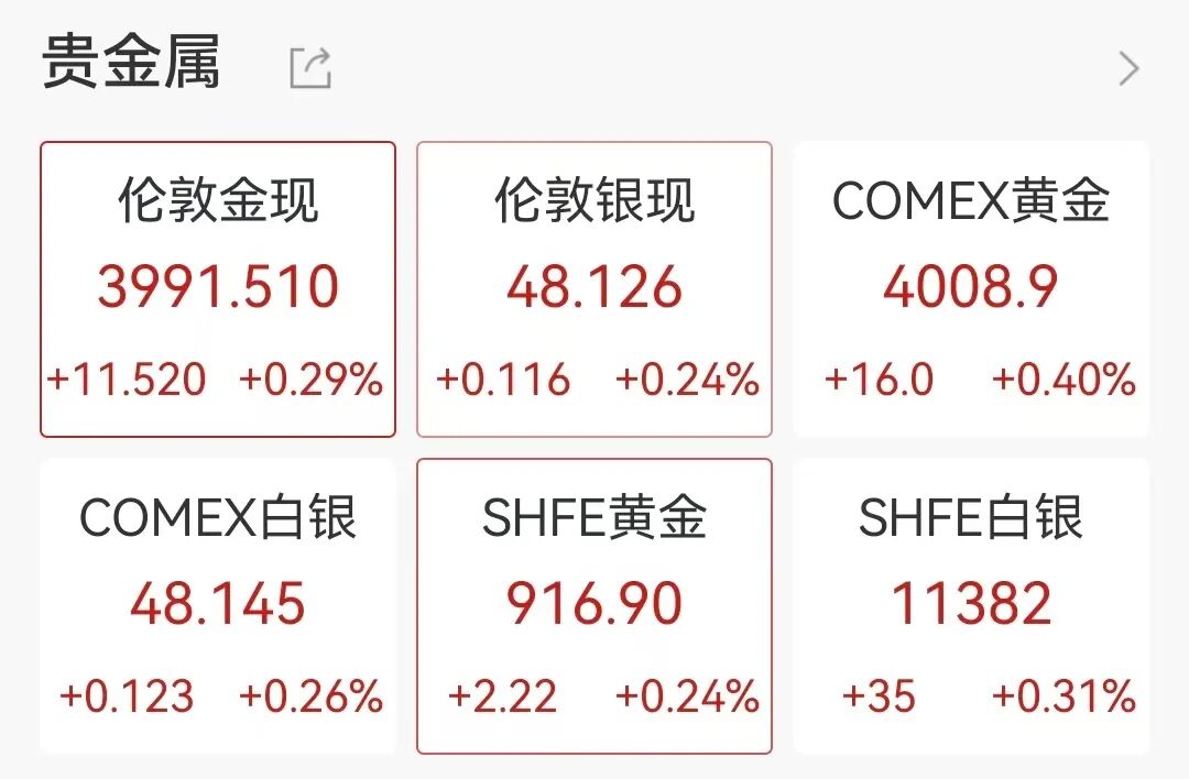 贵金属方面,现货黄金一度重回4000美元/盎司上方,截至发稿回落至3991.51美元/盎司,日内涨0.29%。COMEX黄金报4008.9美元/盎司。