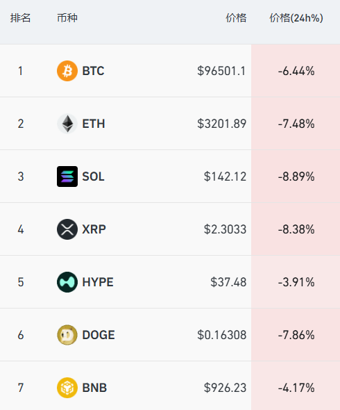 加密货币方面,主要币种大幅下挫。比特币暴跌超6%,报96501美元/枚。据CoinGlass数据显示,过去24小时内,全网超27万人爆仓。