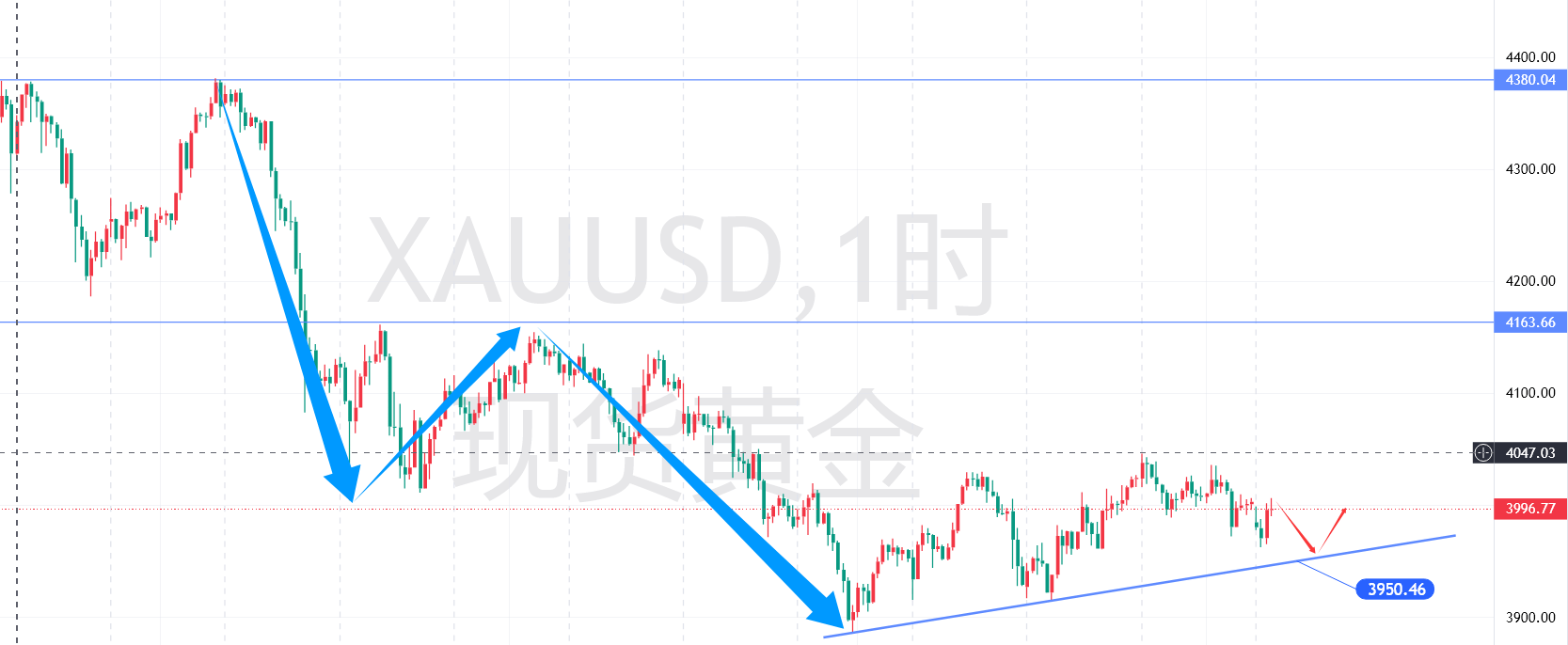 一小时级别的盘面,早盘跳空低开后虽出现短暂反弹,但价格未能突破关键压力位,整体维持震荡格局。在1小时K线图中可以清晰看到,价格低开后反弹至4000附近再度承压下行,4000-4030区间形成了明显的阻力区域。此外,小时图上的均线小时均线依次压制价格,使得短期多头难以组织有效的反攻。