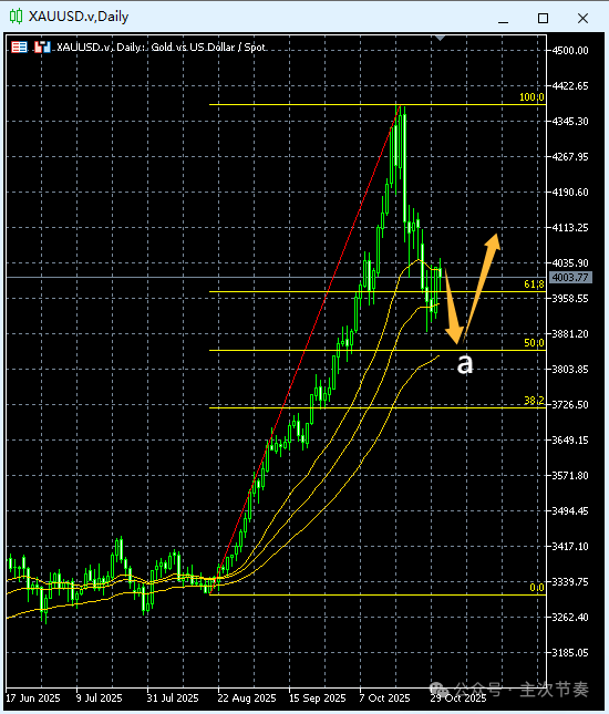 日线图吞没形态之后回调顺利发生,这是在中期涨势不变的情况下,一次阶段性调整。整个回调依然还保持在图中均线系统上方,所以大方向没有变,接下来就是看回调节奏的演变,一般初期都按照最常见的abc之字型结构考虑,再根据实际走势调整。Update: 2025-11-2