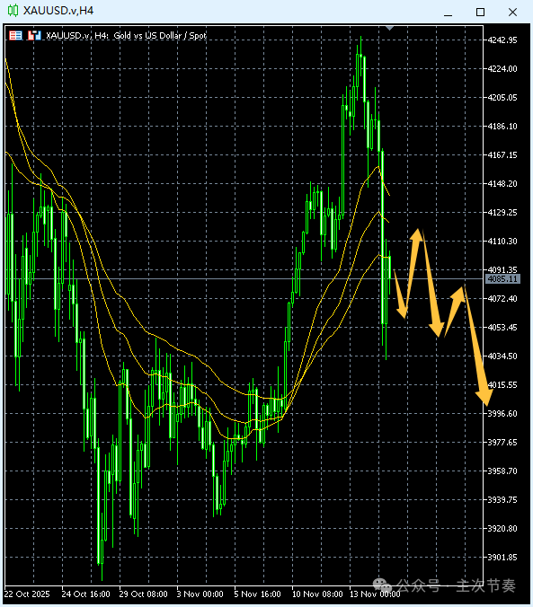 Inception: 2025-11-16上周五黄金下跌力度极大,4小时图上,无论是均线系统还是道氏点支撑,都被跌破。虽然从均线系统角度还未完全进入跌势,但要想短时间内收回上周五跌幅,很难。所以,本周整体是黄金的空方市场,周初越是震荡,对爆发下一轮下跌越有利,这是主次节奏的动能承接模式。如果周初直接大跌,跌幅反而会受限。使用说明: