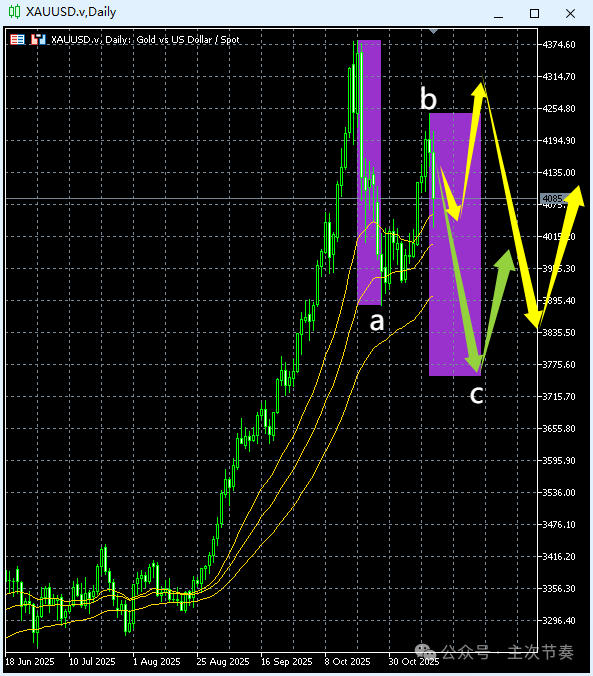 中线回调延续,从波浪结构来看,现在还在a浪回调的过程中,b浪出现的迹象不明显。随着价格回落逐渐逼近均线系统支撑,也就意味着近日继续下落的空间有限,将逐渐转入b浪回升。从均线%回调的共同区域来看,近日的主要支撑在3850附近。Update: 2025-11-16