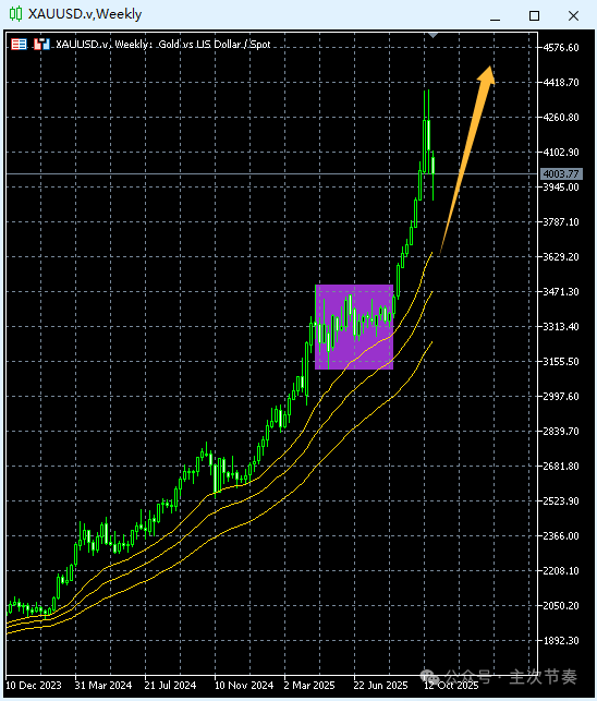 9月月线图继续收出超大的阳线,充分表现出上涨动能的强劲,整体上涨趋势保持得非常完好,思路上只能以多头思路对待,稍微一个上冲就会对4000进行测试。同时要看到,现在价格已经和均线之间有了非常大的距离,在当前这种极端上涨爆发后,随时也面临极端回调的风险。Update: 2025-11-2