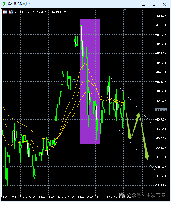 Inception: 2025-11-23上周黄金震荡了一周,单日波幅依然较大。对于黄金的发展来说,此次震荡是发生在一轮有力度的下跌之后,从主次节奏角度分析市场人气,这对于空头的发展会更为有利。所以预期本周黄金整体依然是阶段性弱势,不确定性的变化是震荡反复还会走多久。如果走abc结构反弹,则还有一轮上冲4100以上的机会,是否发生还要每日边走边认定。目前保持宽幅震荡下跌的基本思路不变。使用说明: