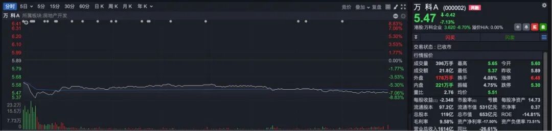 今日早盘,万科A低开近5%,随后快速回落,最大跌幅超过8%。此后跌幅虽有所收窄,但最终依然下跌7.13%,以5.47元报收,市值仅剩653亿元。