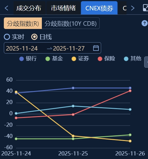 CNEX债券分歧指数显示,基金成为本周(11月24日至27日)债市空头抛盘的主导力量。从市场表现来看,抛压主要来自基金机构,这与近期债市走势基本吻合。