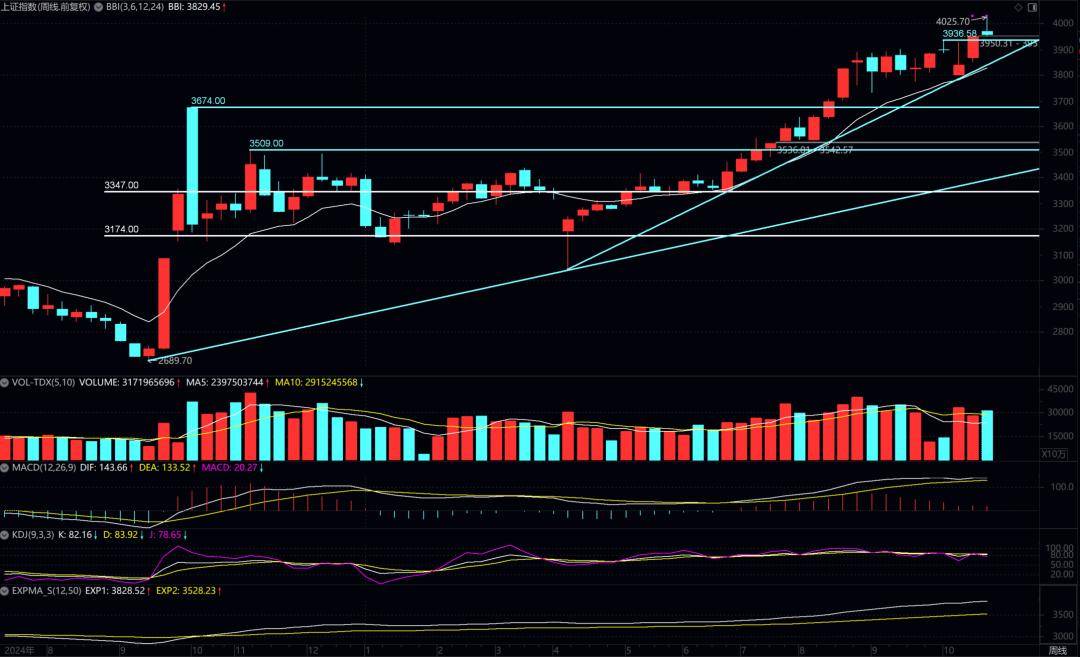 下周收盘在3990之上,多头强势;收盘在3970之上,多头优势明显;收盘在3950之上,多头占优;收盘在3930附近,多空弱平衡状态;收盘在3910之下,空头占优;收盘在3890之下,空头优势明显。强弱分水岭:4025
