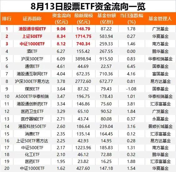 8月13日,A股三大指数集体收涨,上证指数收于3683.46点,创年内新高。当日股票ETF(含跨境ETF,下同)净流出资金约28亿元,其中,行业ETF净流出居前。